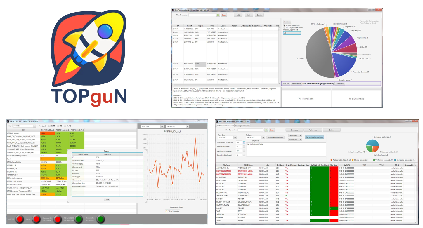 TOPguN is a lightweight and flexible software product that enables tracking and control of all activation and optimisation activities in the RAN Optimisation Departments. It provides a common platform for all registration and reporting of the department’s progress.
